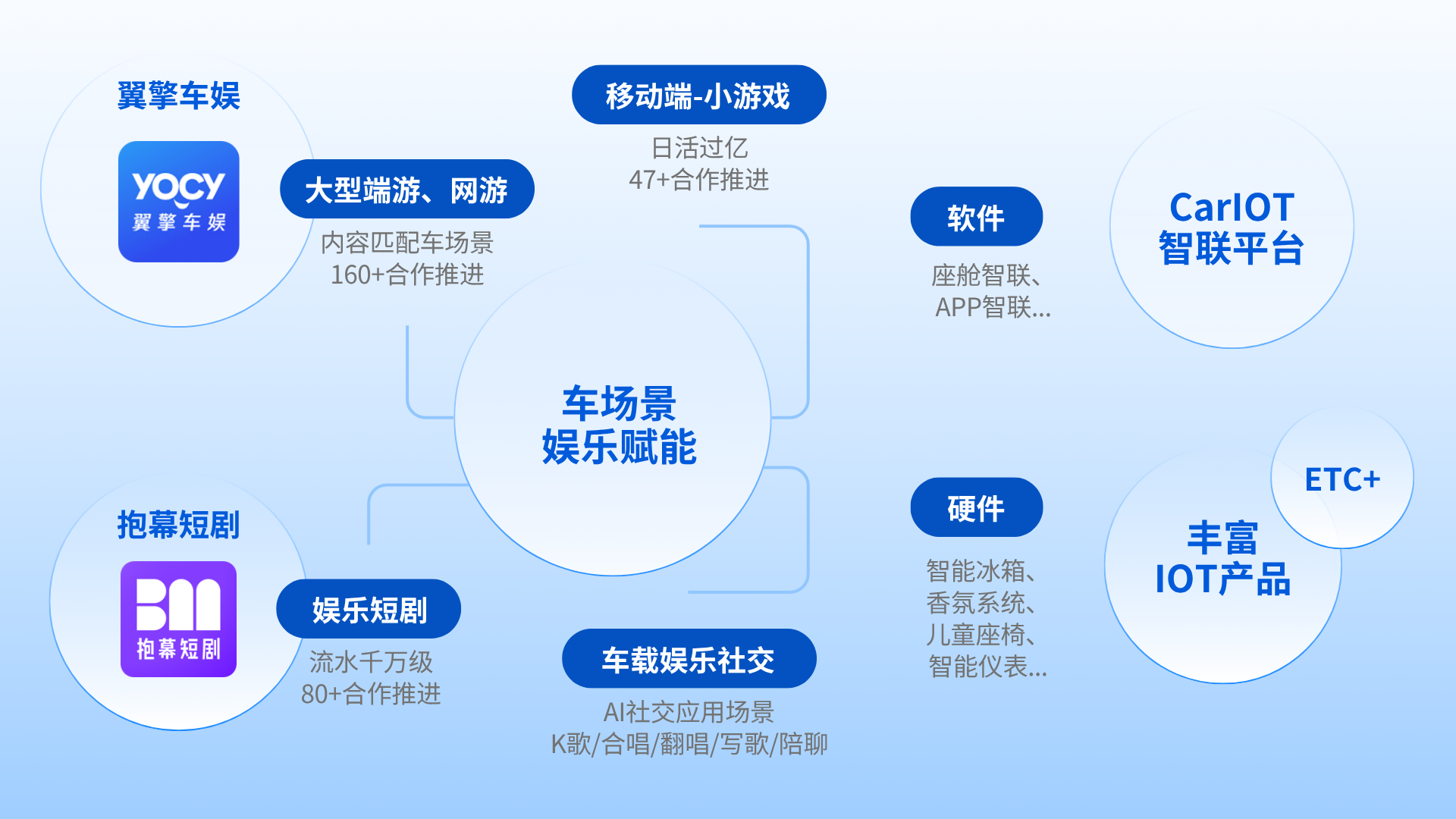 凭借服务40余家车企的深厚积淀,以领先技术打通数据与生态,通过翼擎车娱、抱幕短剧及轻量化ETC+方案,助力主机厂打造“第三生活空间”,显著提升品牌科技感与用户归属感。
