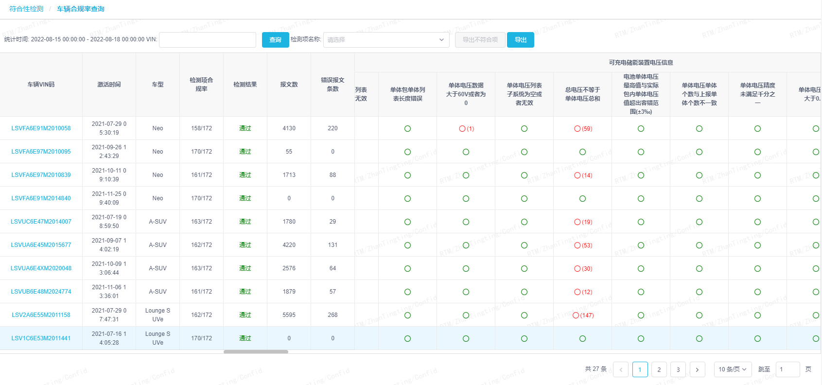 1)提供车辆上传报文数据项的合规性校验,直观展示报文合格率。